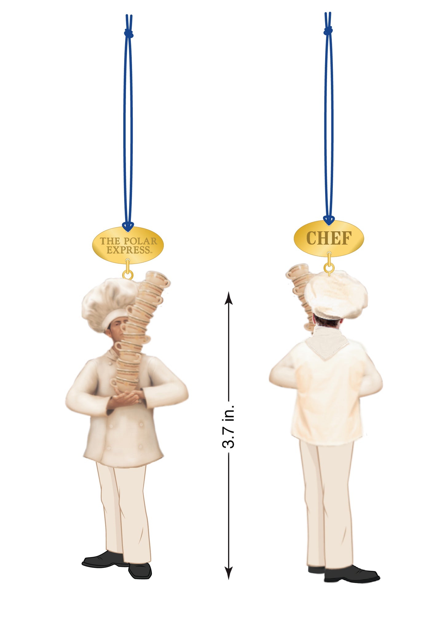 Hot, Hot, Hot Chocolate! This THE POLAR EXPRESS™ ornament Chef is fully sculpted 3D resin, and measures 3-4". Fully sculpted with gold metal embossed logo tag. Packaged in branded gift box. Collect all three character ornaments. See Conductor and Hero Boy.
